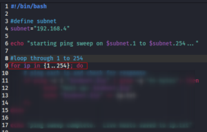Next we use the for statement to set the parameter for the action to be performed → search all ips in the subnet range defined by the ip variable.