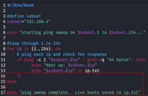 Next is the close the for, if, then loop with fi and done. I added an additional echo statement to indicate when the ip sweep is complete.