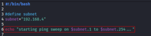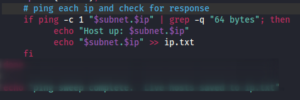 Next step is the if, then statement → we use the piped commands from before to build the if, then statement → Only changes: replaced 192.168.5 with two arguments → $subnet and $ip “$subnet.$ip”, 192.168.5 = $subnet and .x (last octet of ip) = $.ip → This paramenter was initially defined in the “starting ping sweep” echo statement above. The then statement that follows below, prints to terminal each host that is ping-able (up) and prints line output as input to ip.txt.