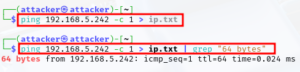 Set the ping count to 1 and send the output to text file. To grab the line pertaining the ip, we can pipe “|” grep the standard “64 bytes” message from the file to return the ping output to the terminal.