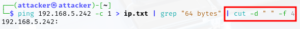 Next step is the if, then statement → we use the piped commands from before to build the if, then statement → Only changes: replaced 192.168.5 with two arguments → $subnet and $ip “$subnet.$ip”, 192.168.5 = $subnet and .x (last octet of ip) = $.ip → This paramenter was initially defined in the “starting ping sweep” echo statement above. The then statement that follows below, prints to terminal each host that is ping-able (up) and prints line output as input to ip.txt.