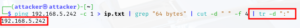 We only want to return the ip address so we can pipe that to the cut command and add a delimiter so only the ip is returned. The delimiter specified is a space and (-f 4) # of spaces to count before displaying output.